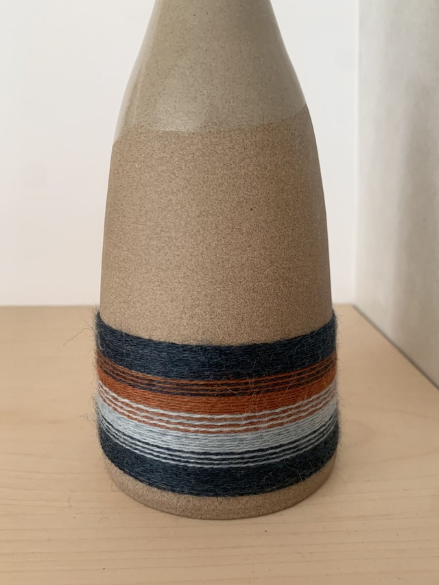 Bouteille tournée en grès caramel, émail transparent brillant à l’intérieur et en haut à l’extérieur. Contraste terre brute et émail brillant. Laine organique teintée aux pigments naturels.