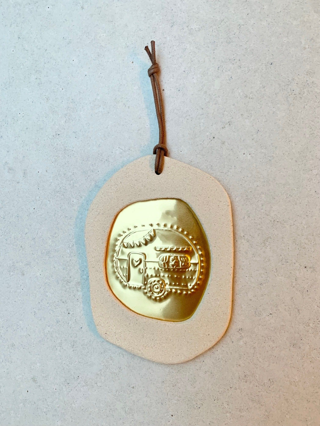 Cadre en grès caramel et illustration embossée sur aluminium doré. Dos en feutrine, cordon en coton ciré camel.