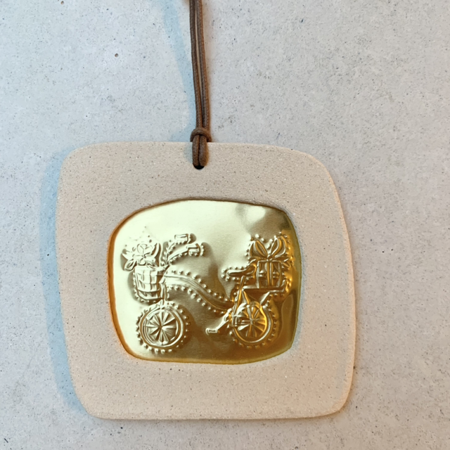Cadre en grès et illustration embossée sur aluminium doré. Dos en feutrine, cordon en coton ciré camel.