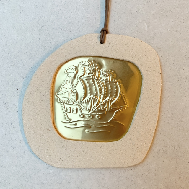 Cadre en grès caramel et illustration embossée sur aluminium doré. Dos en feutrine, cordon en coton ciré camel.