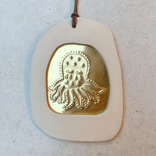 Cadre en grès caramel et illustration embossée sur aluminium doré. Dos en feutrine, cordon en coton ciré camel.