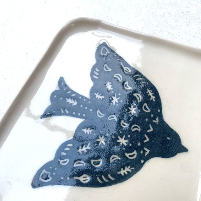 Petit plat en grès décoré et gravé à la main à l’engobe bleu pétrole. Email transparent brillant.